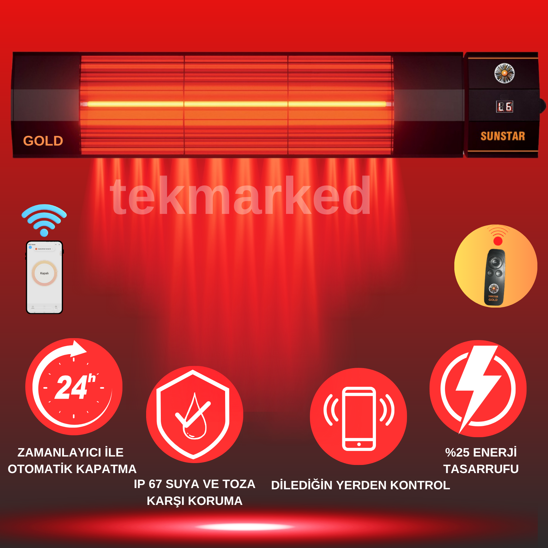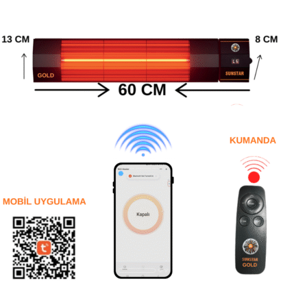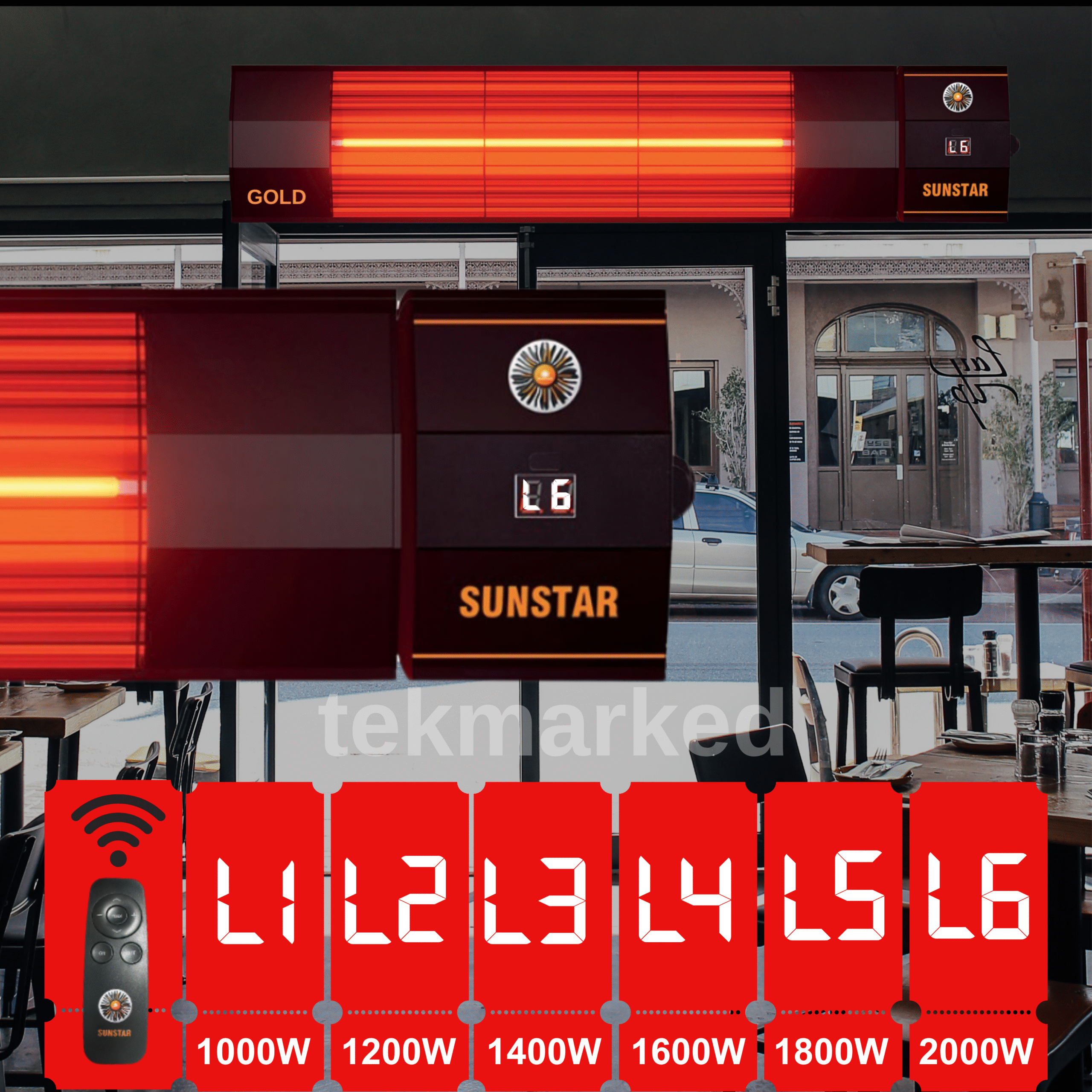 Sunstar yeni nesil uzaktan kumandalı 6 kademeli özel kırmızı renk ısıtıcı, Devrilme eminiyetli. Açık ve kapalı alanları (cafe, spor salonu, restaurant, otel, bahçe, kışlık, ev, ofis, vb) daha az maliyetle ısıtın; Yeni Nesil Isıtıcı Rüzgardan ve Hava Akımından Etkilenmez Diğer Sistemlere Göre %80 Daha Verimli Çalışır Açık ve Kapalı Alanları Kolayca Isıtır Voltaj220; 240V Heartz50; 60 Hz Power:2000 W Isıtma Alanı (kapalı alan)10; 14 m2 Isıtma Alanı (açıkalan)8; 10 m2. Boyutları: 50 cm uzunluk, 13 cm yükseklik, 8 cm derinlik. 2 yıl garantilidir.